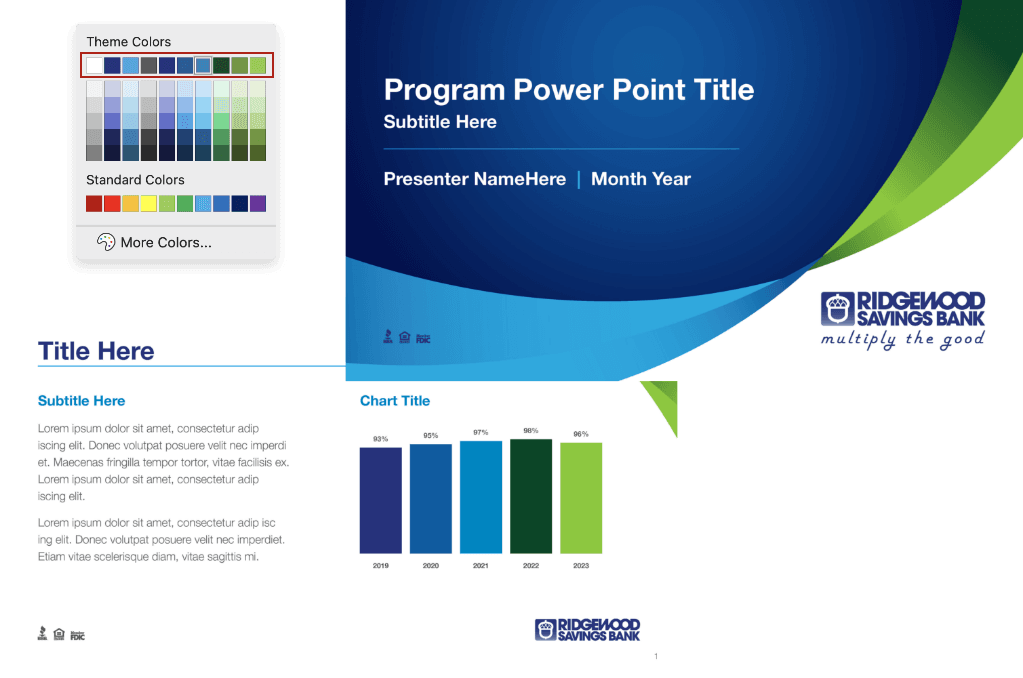To adhere to our current brand standards and maintain consistency throughout internal and external presentations, Ridgewood has developed a PowerPoint template for all team members to use. This template features a professional and cohesive layout that seamlessly integrates Ridgewood’s color scheme, typography and logo usage rules, as well as the required regulatory and compliance icons.